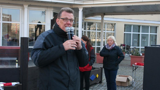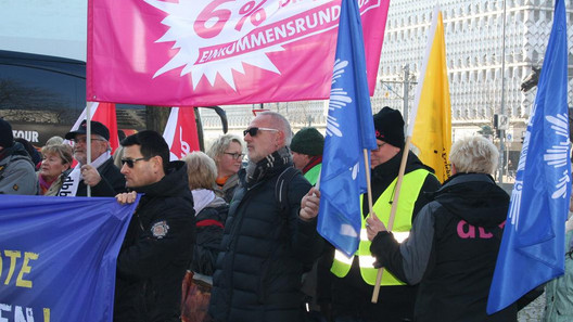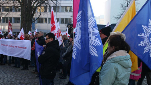„Wir haben gute Argumente für unsere Forderungen, von den Arbeitgebern kam aber bisher nur heiße Luft“, sagte Ulrich Stock, dbb-Landesvize. Die Chance für einen Kompromiss am Verhandlungstisch am 16./17. Februar sei gut. „Eine vierte Runde ist nicht vereinbart und eine Schlichtungsvereinbarung existiert nicht. Jetzt müssen die Arbeitgeber liefern“, so Stock. In ihrer Mittagspause waren, verbeamtete Lehrerinnen und Lehrer, Beamtinnen und Beamte aus den Ministerien und den nachgeordneten Behörden sowie Polizeivollzugsbeamte vor das Hotel Ratswaage gekommen, um ihre Solidarität mit den Angestellten zu bekunden. Ihnen ist klar, von einem in der Einkommensrunde erreichten guten Kompromiss haben die Beamten nur etwas, wenn das Ergebnis wirkungs- und zeitgleich auf sie übertragen wird. „Dann muss die schwarz-rot-grüne Landesregierung liefern und ihre Zusage aus dem Koalitionsvertrag, das Tarifergebnis eins zu eins auf die Beamten zu übertragen, einhalten. „Insbesondere auf eine wirkungsgleiche Übertragung wird der Beamtenbund beim Finanzminister nach Vorliegen einer Tarifeinigung drängen“, sagte Stock.