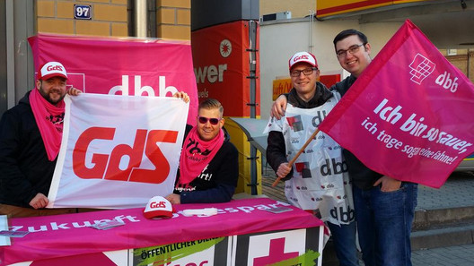 Die Botschaft auf den Transparenten am 13. April 2016 in Halle vor der Tür des kommunalen Arbeitgeberverbandes war eindeutig: „Vorfahrt für die Jugend“, „BefristungsSTOP“, „Baustelle öffentlicher Dienst“. Nachdem es auch nach der zweiten Verhandlungsrunde für die Tarifbeschäftigten von Bund und Kommunen keine entscheidende Annäherung der unterschiedlichen Positionen gab, hat die dbb jugend sachsen-anhalt in einer Mahnwache nicht nur eindringlich auf ihre Forderungen hingewiesen, sondern sie auch in einem persönlichen Gespräch mit dem Verbandsgeschäftsführer des kommunalen Arbeitgeberverbandes Sachsen-Anhalt, Detlev Lehmann, erörtert.